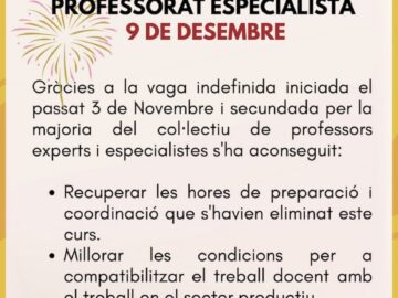 Després d’un procés de lluita unitària i una vaga indefinida de 37 dies, el professorat expert i especialista de la Comunitat Valenciana assoleix un acord transcendental que reconeix la jornada que havien estat realitzant i estableix un nou model de […]