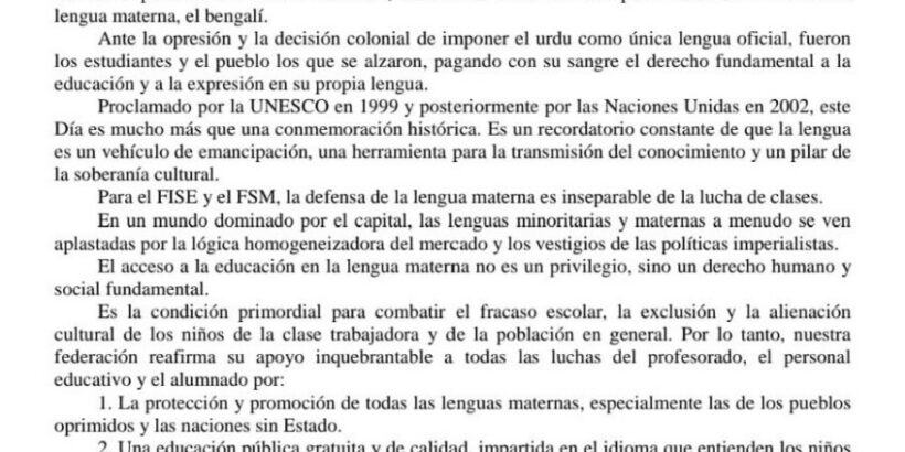 3. La resistencia contra toda forma de discriminación lingüística, que con demasiada frecuencia enmascara la dominación de clase y la opresión nacional. En este día de recuerdo y lucha, la FISE (Federación Mundial de Sindicatos de la Enseñanza) honra la memoria de los mártires de 1952 y expresa su plena solidaridad con los sindicatos de docentes y los pueblos de todo el mundo que luchan por preservar su identidad lingüística frente a la embestida del neoliberalismo, el neocolonialismo y el imperialismo.