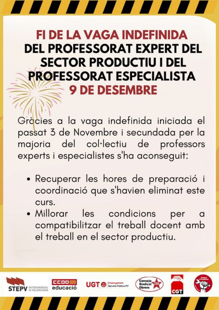 Després d’un procés de lluita unitària i una vaga indefinida de 37 dies, el professorat expert i especialista de la Comunitat Valenciana assoleix un acord transcendental que reconeix la jornada que havien estat realitzant i estableix un nou model de contractació digne.